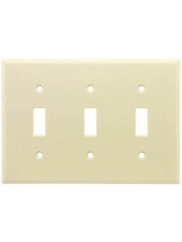 Leviton triple gang toggle switch plate cover available in 7 different colors. This residential grade switchplate is made of thermoset plastic and measures a standard 4.50" tall by 6.38" wide. This standard wall plate has a projection of .25". The black color option is available only as commercial grade nylon(unbreakable).